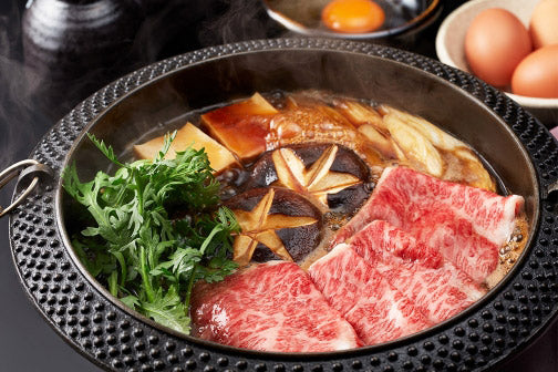 Combine vegetables in the base broth and simmer. While a variety of vegetables is available, mushrooms like shiitake, known for enhancing umami, and onions, adding a touch of sweetness, are recommended here. Once the vegetables have softened slightly, arrange 4-5 slices of meat over them. Crack and beat "koku-mi tamago" (rich-flavored egg) in a separate bowl. Once the meat and vegetables are cooked with enhanced flavor, dip them in the egg and enjoy.