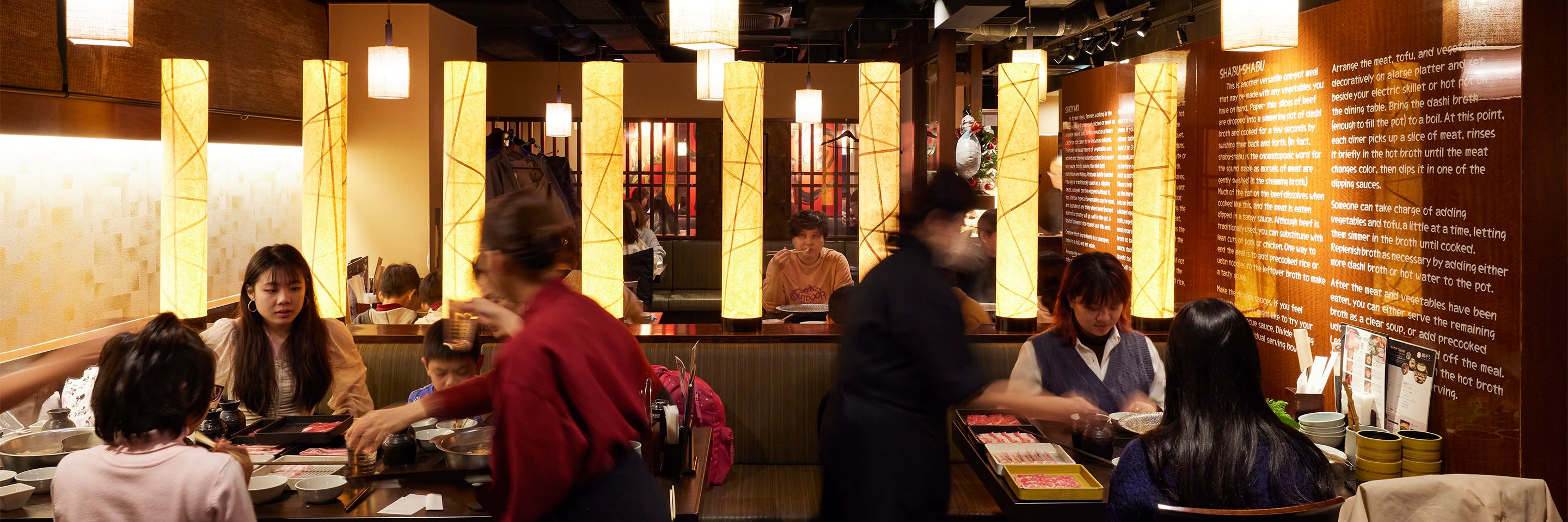 雷門の近くにある、厳選された食材を使った本格的なしゃぶしゃぶ、すき焼きが楽しめるレストランです。和紙の照明が灯る、日本の伝統美を取り入れた和モダンな空間です。広めの席間を確保したテーブル席は、少人数から大人数まで幅広いシーンに対応できるレイアウトとなっています。非日常的な空間で、大切な方とのひとときをお過ごしください。