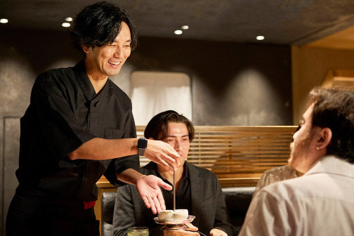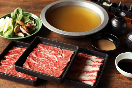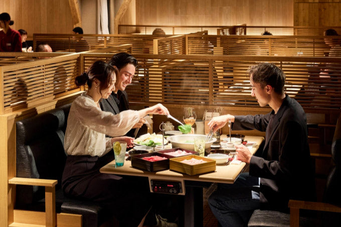 为了让顾客品尝到美味,肉片请一次烫一片,蔬菜请少量地烫,然后轻轻蘸上酱汁。还有很多其他美味的吃法,所以请允许我们的店员帮助您一起寻找您专属的独家“美味”。