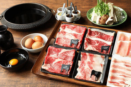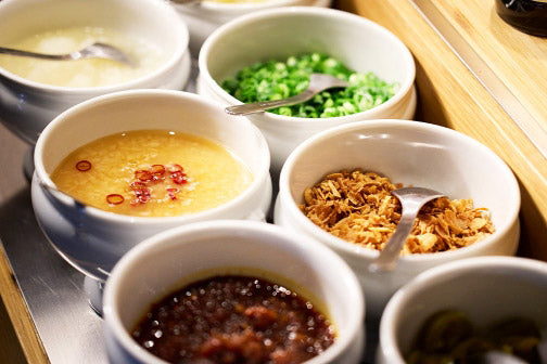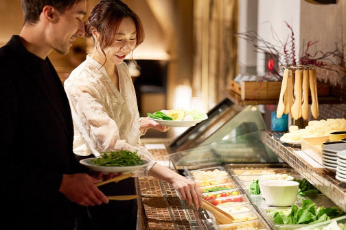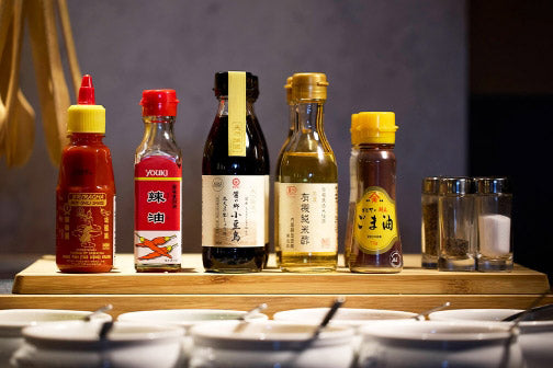 为了让顾客更加尽兴地享用涮涮锅和寿喜烧,我们准备了来自世界各地的配料。首先,您可以享受酱料的原汁原味,然后逐渐添加配料,制作合您口味的美味酱料。